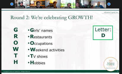 We also played themed Scattergories with words like "CLIENT," "GROWTH," and "ADVOCATE." Our folks are creative, and we had three winners. Congratulations, Tracy Bates, Billie Hardison, and Susan Greene!